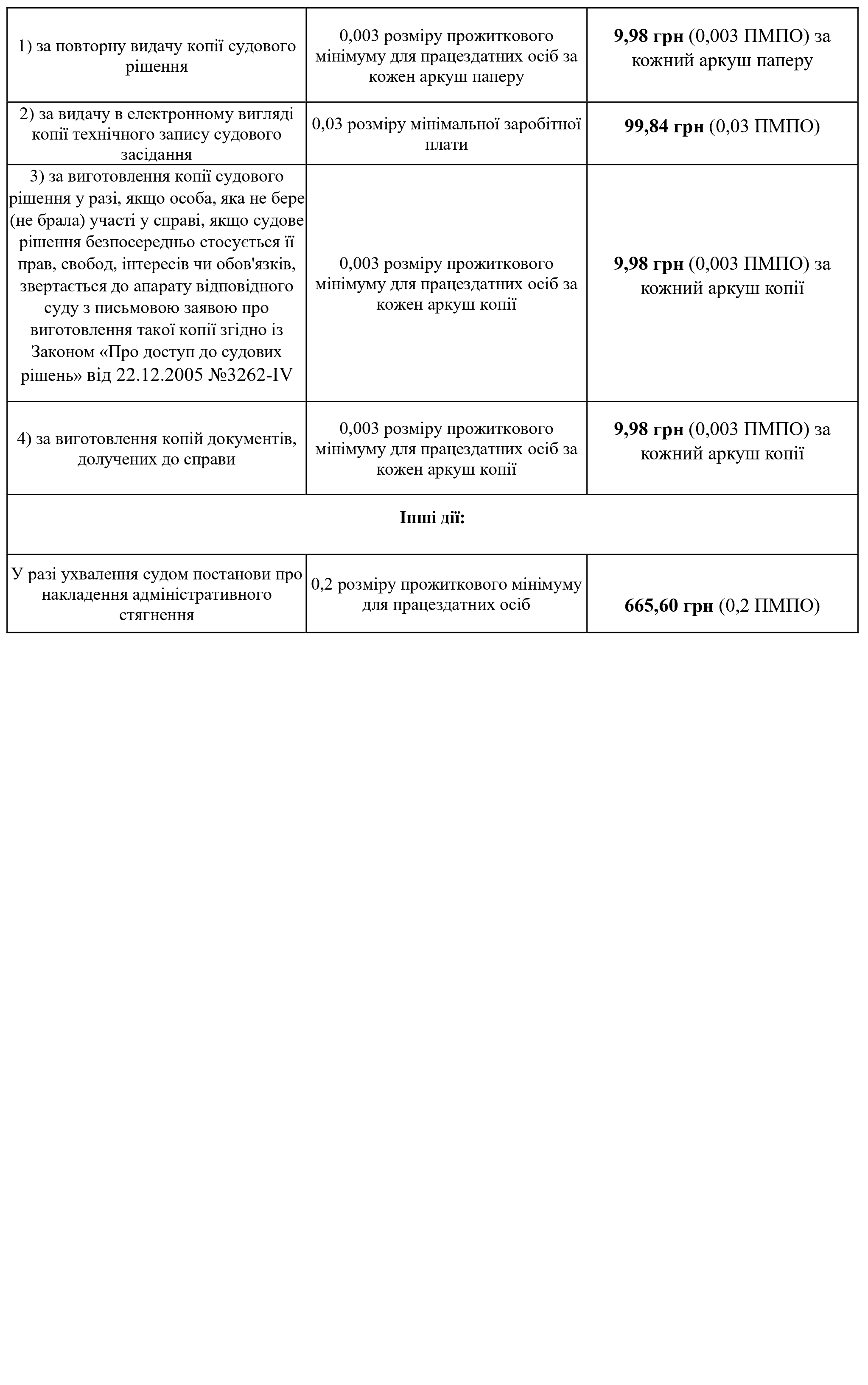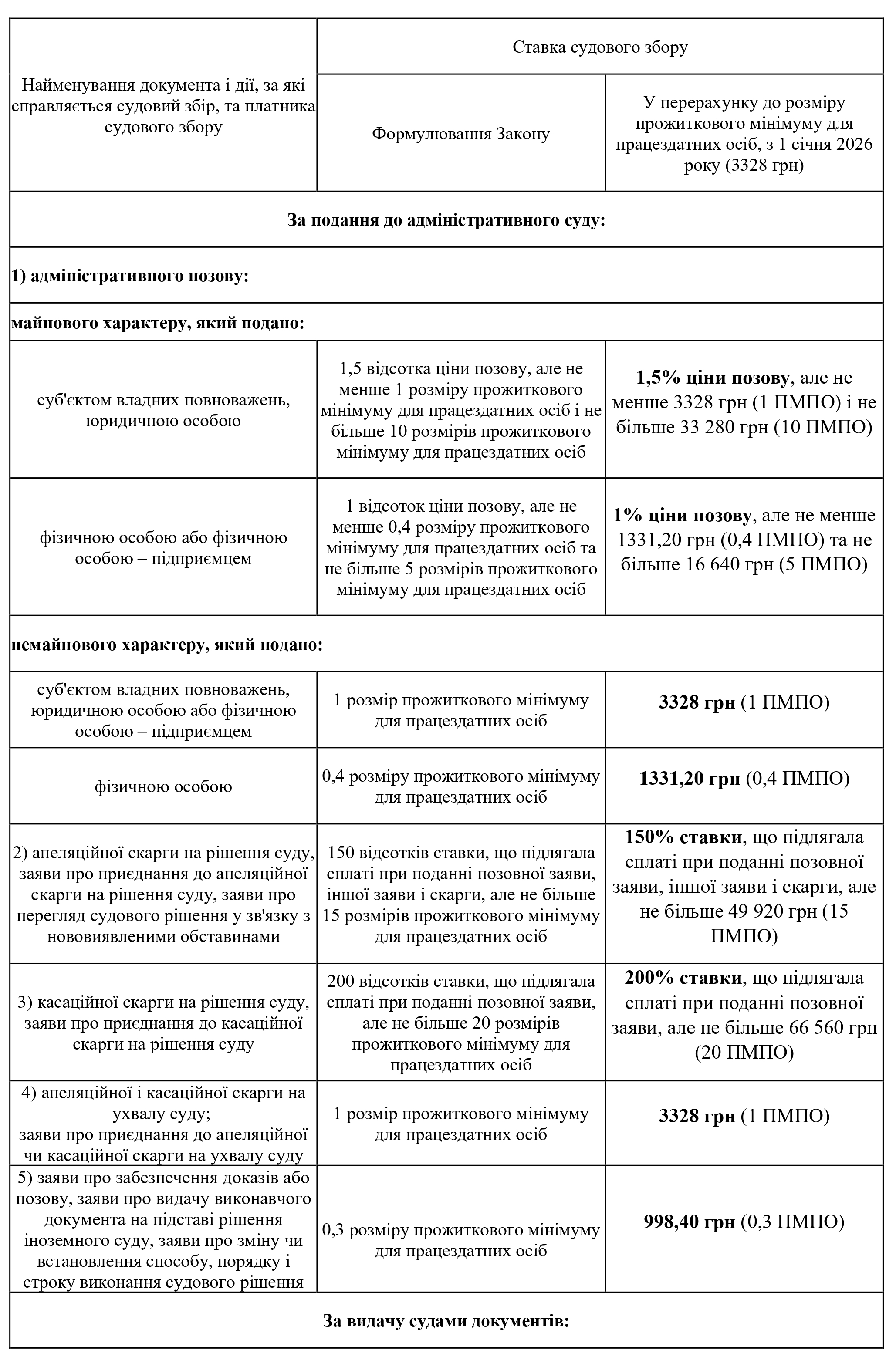 Звертаємо увагу, що у зв’язку зі зміною розміру прожиткового мінімуму для працездатних осіб з 1 січня 2026 року діятимуть нові розміри ставок судового збору.